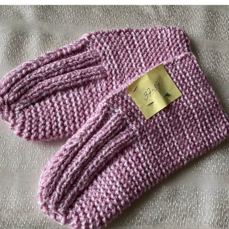 Varma hemstickade tofflor, 100% dubbelt akrylgarn. Lägg i en sula så blir de ännu varmare. Kan maskintvättas i inte alltför varmt vatten. Färg: rosa med glittertråd.