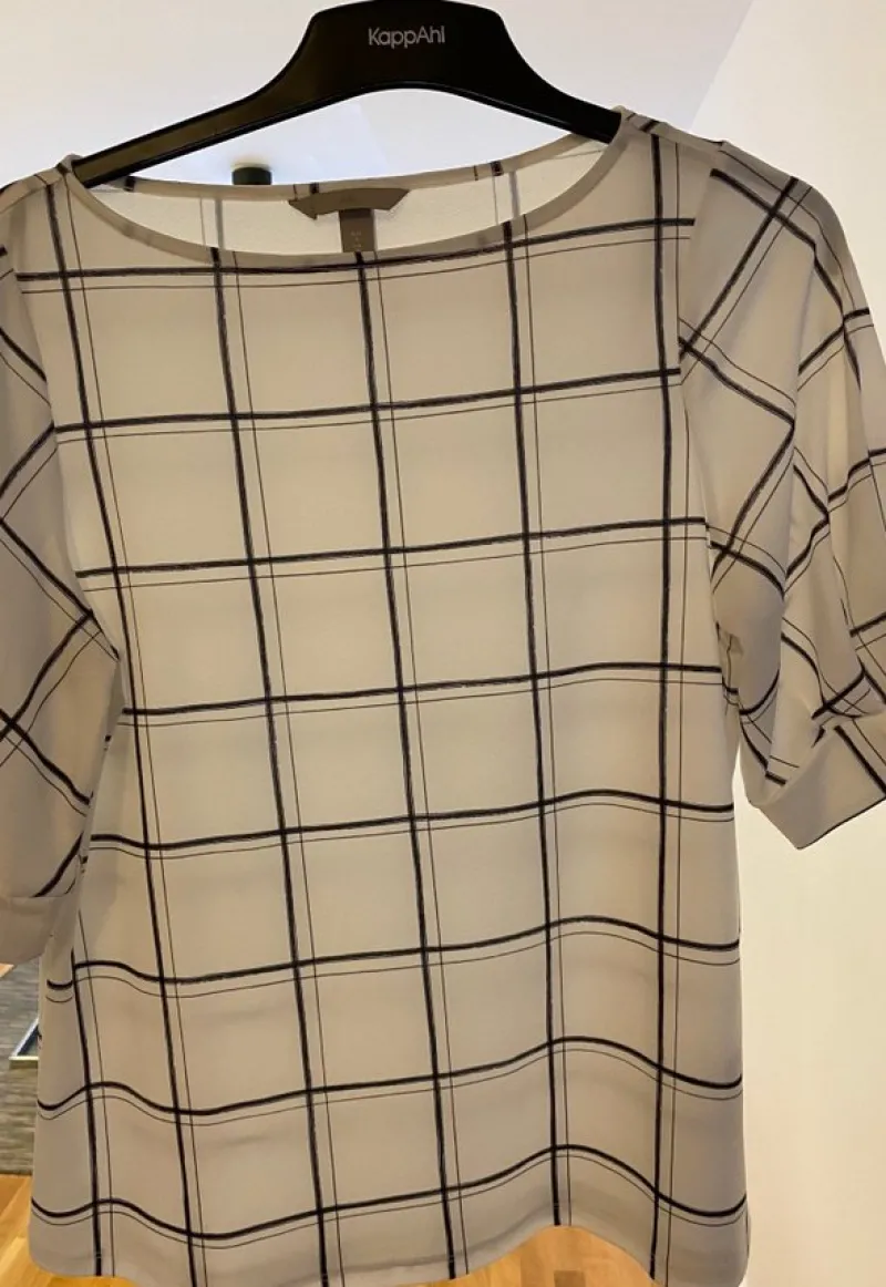 En båtringad topp i trikå av återvunnen polyester. Toppen har kort puffärm.