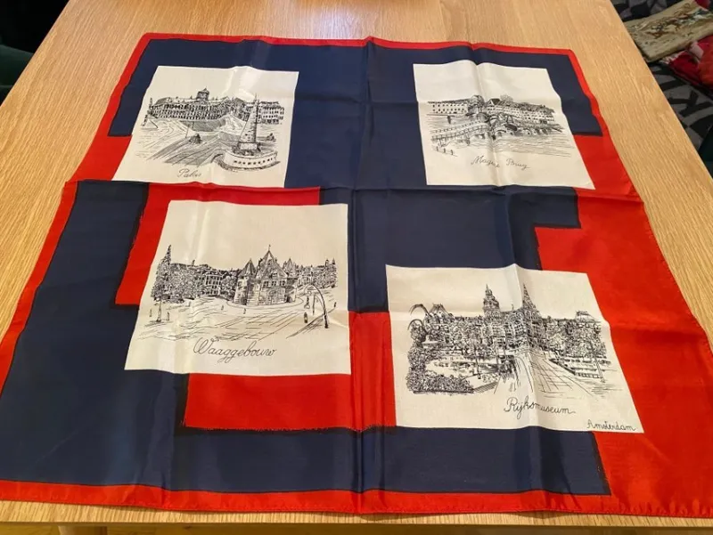 Två fina vintage scarfar. Den ena med motiv av olika nederländska städer, den andra med ett traditionellt holländskt mönster.