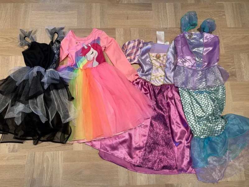 Sött klädpaket med fyra fina utklädningsklänningar för barn, passar storlek 122-128. Klänningarna är i olika färger och stilar, inklusive en enhörningsklänning med fjärilsvingar, en prinsessklänning, en svart häxklänning och en sjöjungfruklänning. Sjöjungfruklänningen har en söm som är sönder, annars är alla klänningar i fint skick och redo för nya äventyr ??.