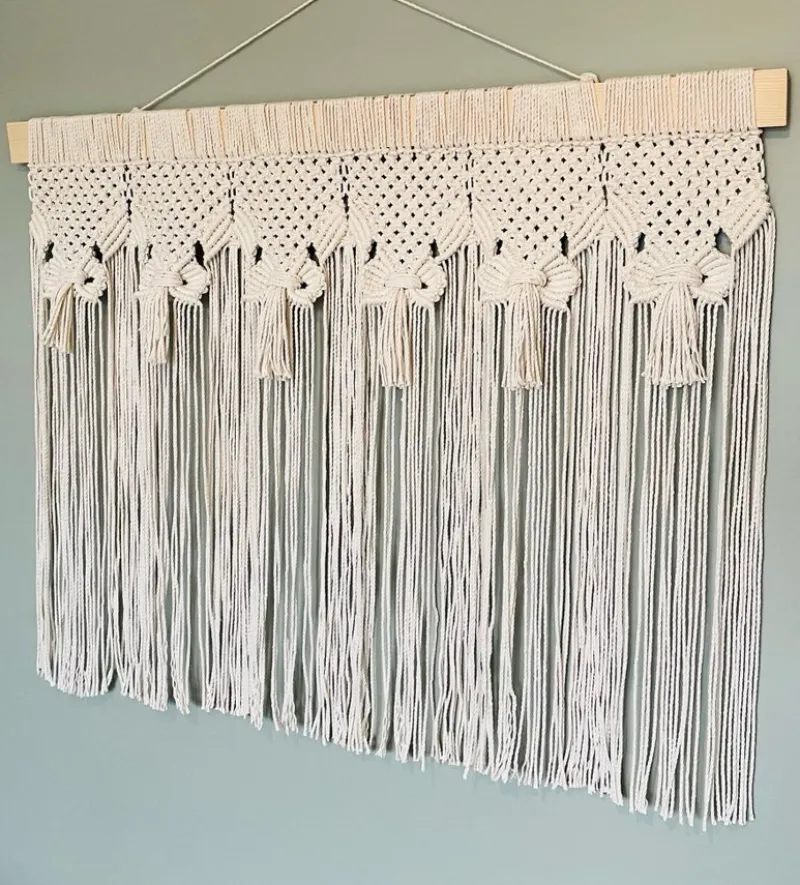 Introducerar Väggbonaden ”Harmoni ”, en unik makraméskapelse som förmedlar både traditionellt hantverk och modern design. Denna eleganta väggbonad är perfekt för att tillföra en naturlig och lugnande känsla till varje rum.