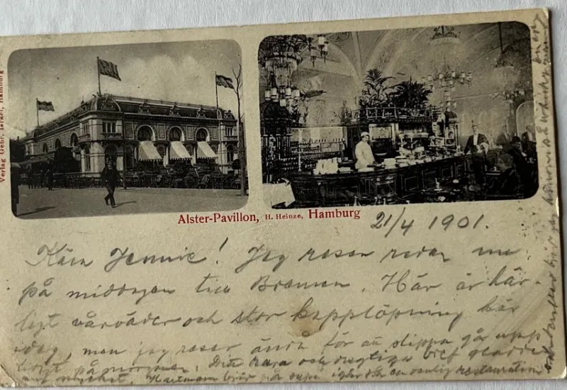 Gammal vykort från Hamburg, Alster-Pavillon, daterad 23/4 1901. Visar två bilder; en exteriör och en interiör av paviljongen. Poststämplat och skickat till Göteborg.