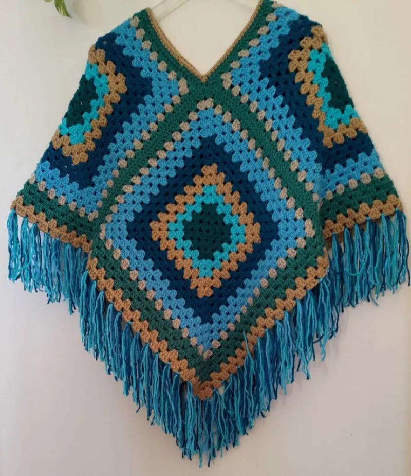 Old fashion, Varm mysig handvirkad Poncho i stora mormorsrutor med fransar.