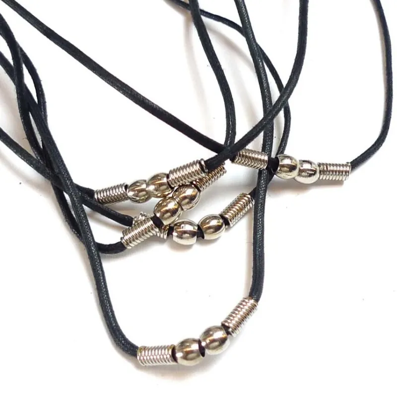 Fem halsband av svart bomullscord med silverpläterade metalldelar.
