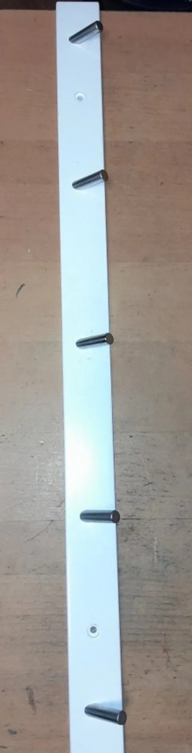 En vit väggmonterad klädhängare med flera krokar i metall. Perfekt för att hänga upp kläder, handväskor eller andra accessoarer. Enkel och stilren design som passar in i de flesta hem.