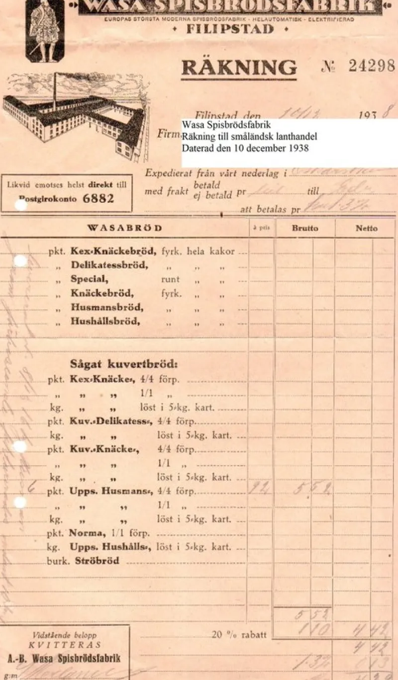 Till försäljning här finns en räkning från Wasa Spisbrödsfabrik i Filipstad till en lanthandel i Småland som är daterad den 10 december 1938. Den har veck och hålslag och är lite smutsig. Till höger finns också en lite reva där några millimeter saknas.