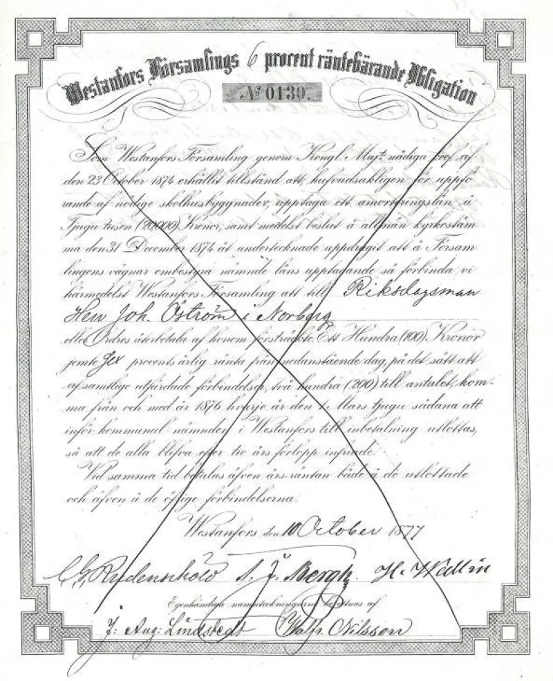 Westanfors Församlings, 6 % Obligation, 1877, Westanfors, endast ett blad och mak.